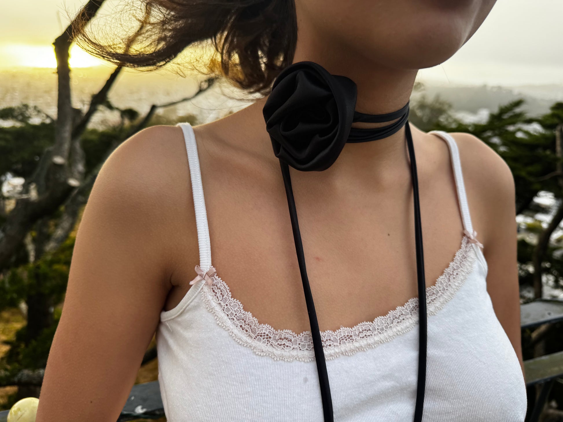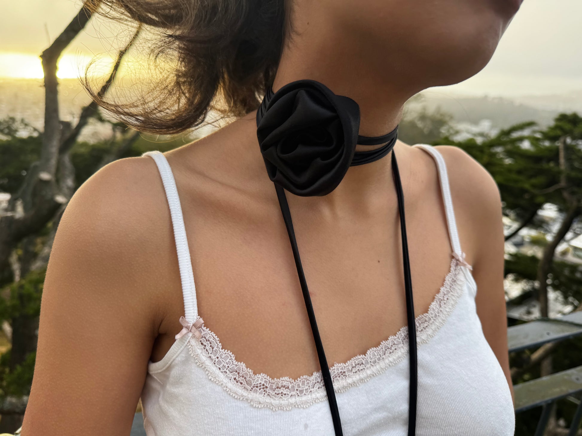 Silk rose designed for effortless versatility. Wear it as a choker, bracelet, hairpiece, belt or bag charm.